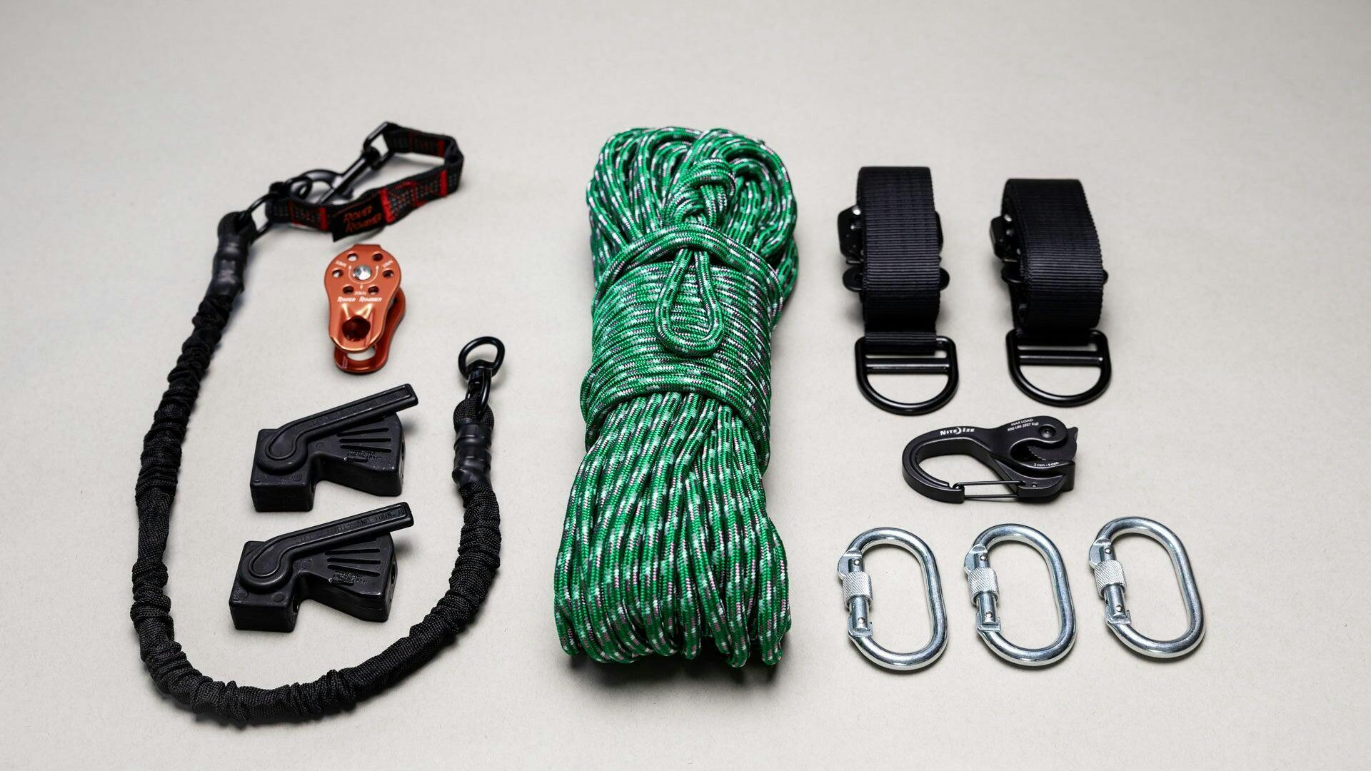 Additional hardware for multiple dogs: Pulley, carabiner, 2 rope clamps, neck-safe bungee segment
