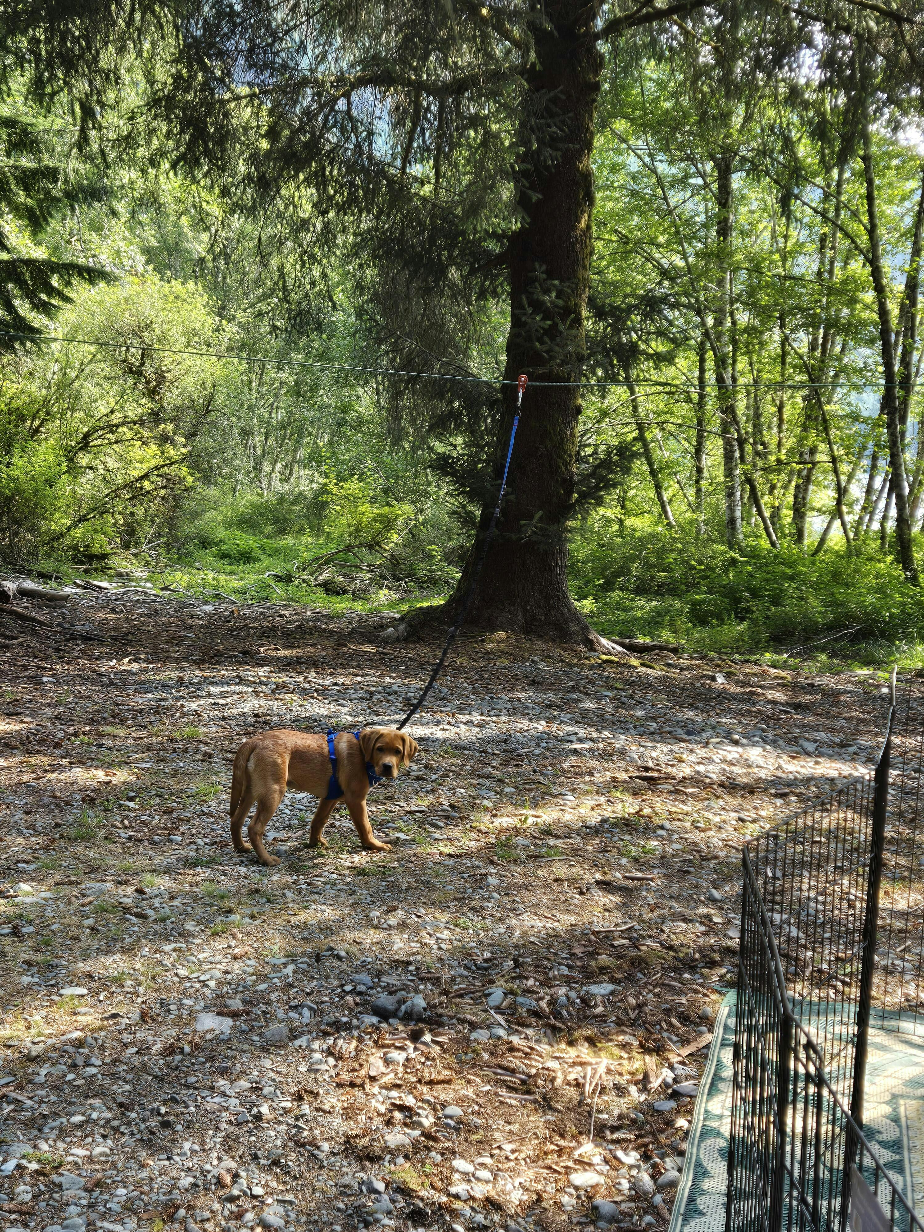 Having just added a 3rd dog to our family, we needed a way to keep the puppy safe but allow him to exercise while camping. The Sky Track Portable Dog Run allowed us to do so with excellent quality and safety. Our 4 month old fox red lab was able to move around securely, allowing us to be able to focus on other things during our recent camping trip. Can't say enough good things about the Sky Track run!!
